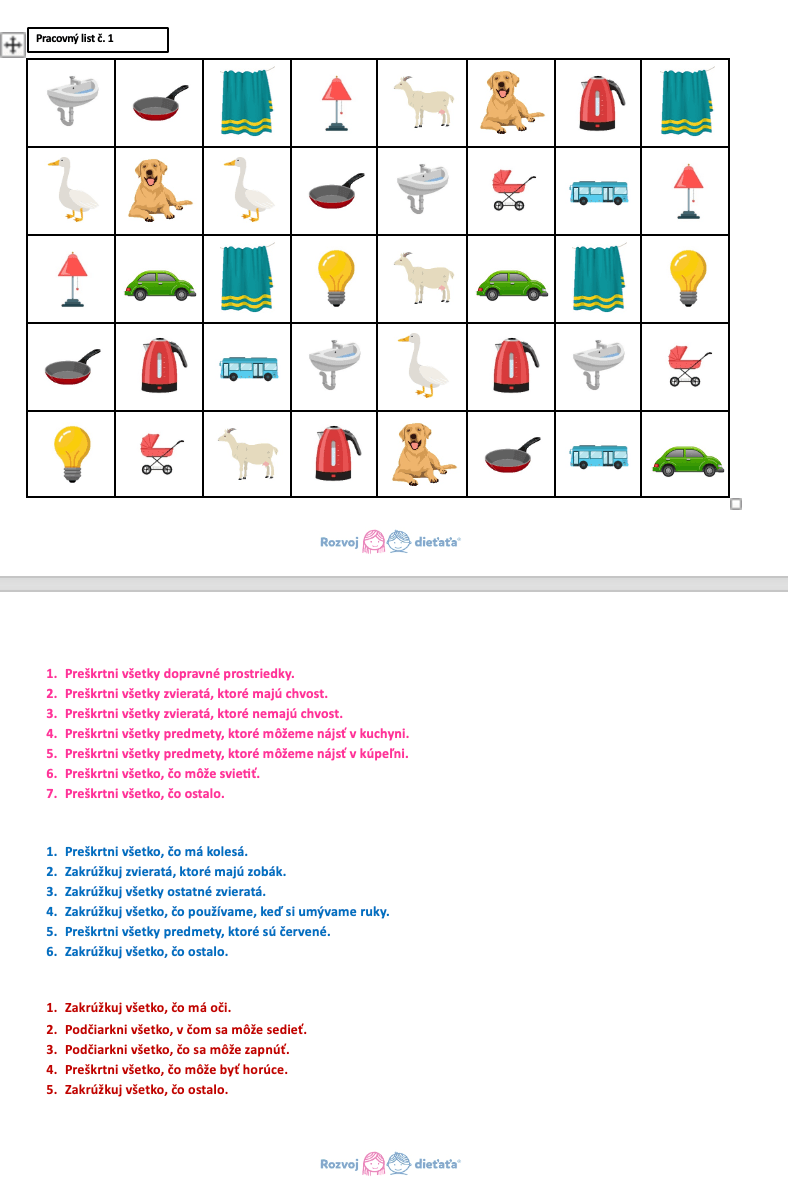 Dieťa musí pozorne počúvať inštrukciu dospelého, ktorú môže zopakovať aj viackrát, a podľa počutej inštrukcie označuje jednotlivé obrázky v tabuľke. Pracovný list môžete založiť do stieracieho obalu, aby bolo možné opätovne použiť materiál.