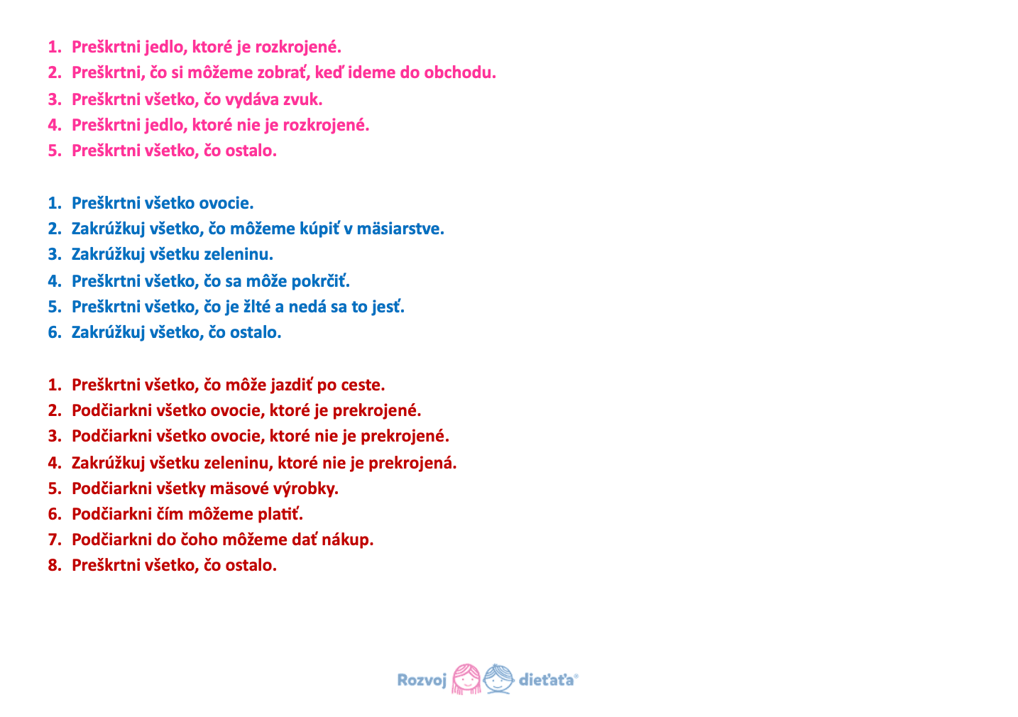 Odporúčame trénovať s dieťaťom všetky typy inštrukcií, a teda vypĺňanie jedného pracovného listu realizovať minimálne 3-krát (ružové inštrukcie, modré inštrukcie, bordové inštrukcie).
